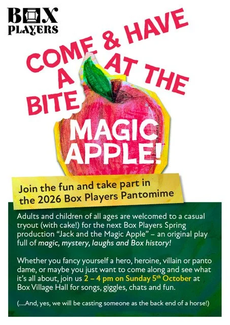 Adults and children of all ages are welcomed to a casual try out (with cake!) for the next Box Players Spring production “Jack and the Apple” - an original play full of magic!